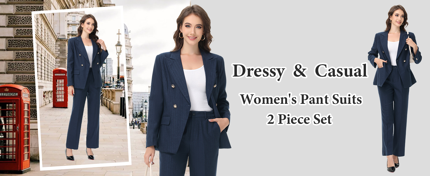 There is a long sleeve blazer and long pants consisting of pant suits for women dressy.