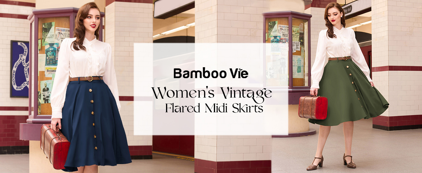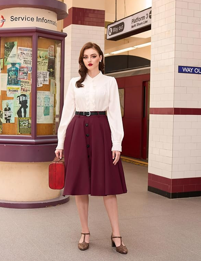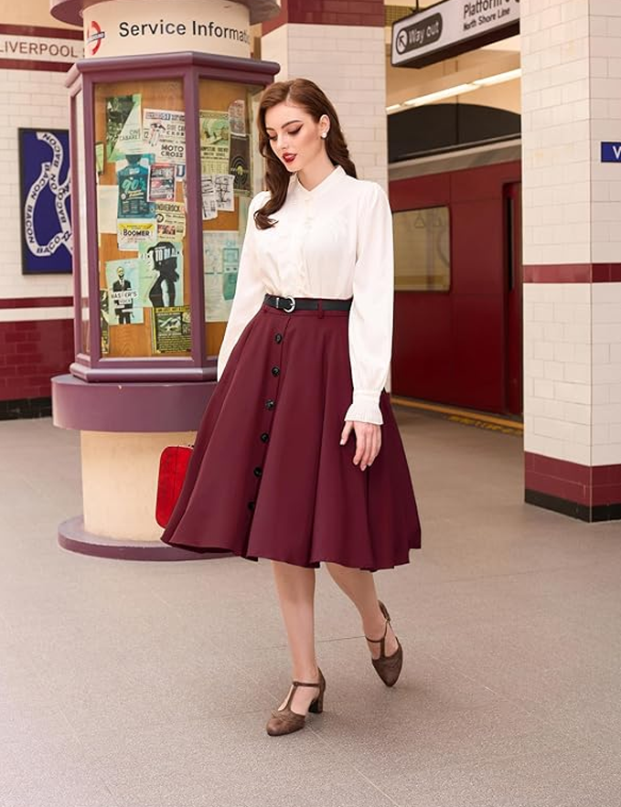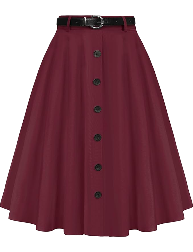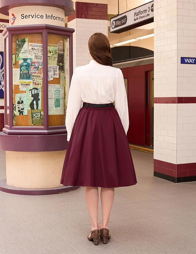 Women’s Vintage High Waist A-Line Flared Midi Skirt with Pockets & Belt