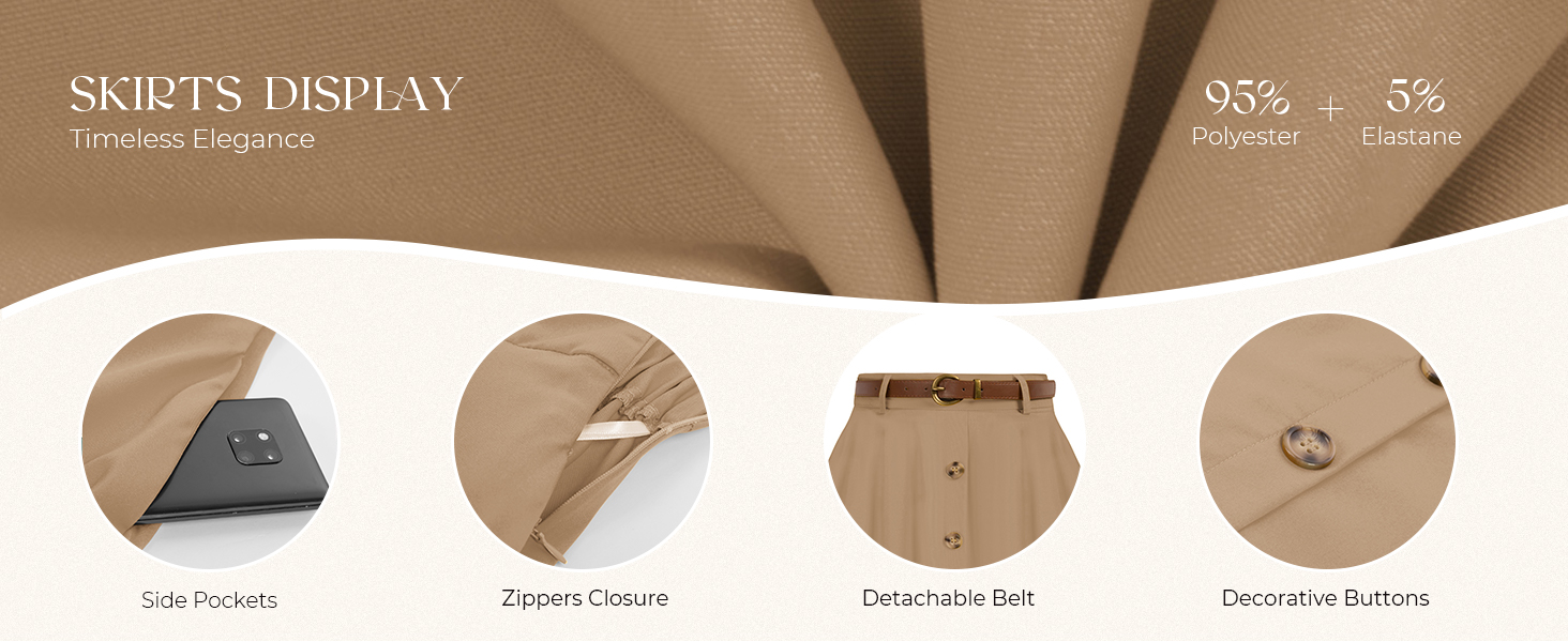 Elegant A-line skirt featuring a high waist, detachable belt, decorative buttons, side zipper, and practical side pockets for a versatile and stylish look